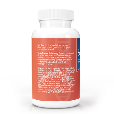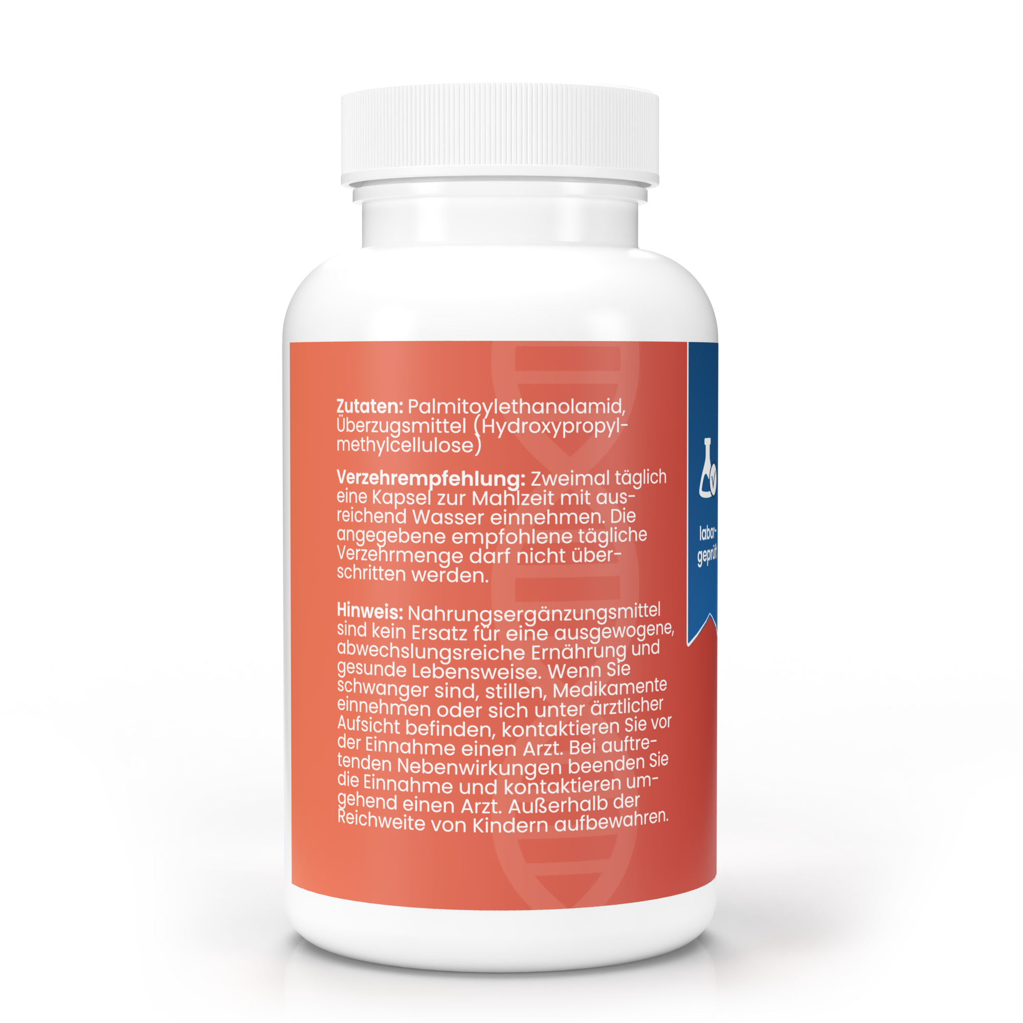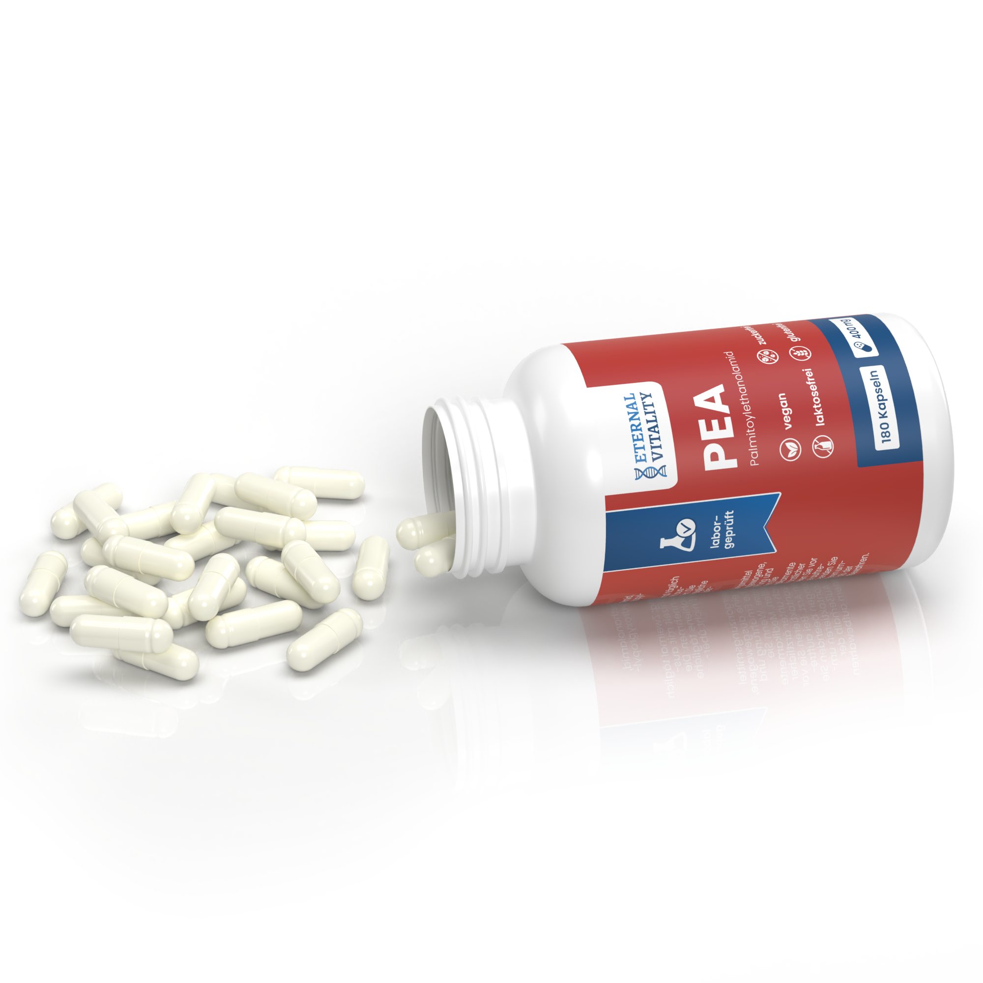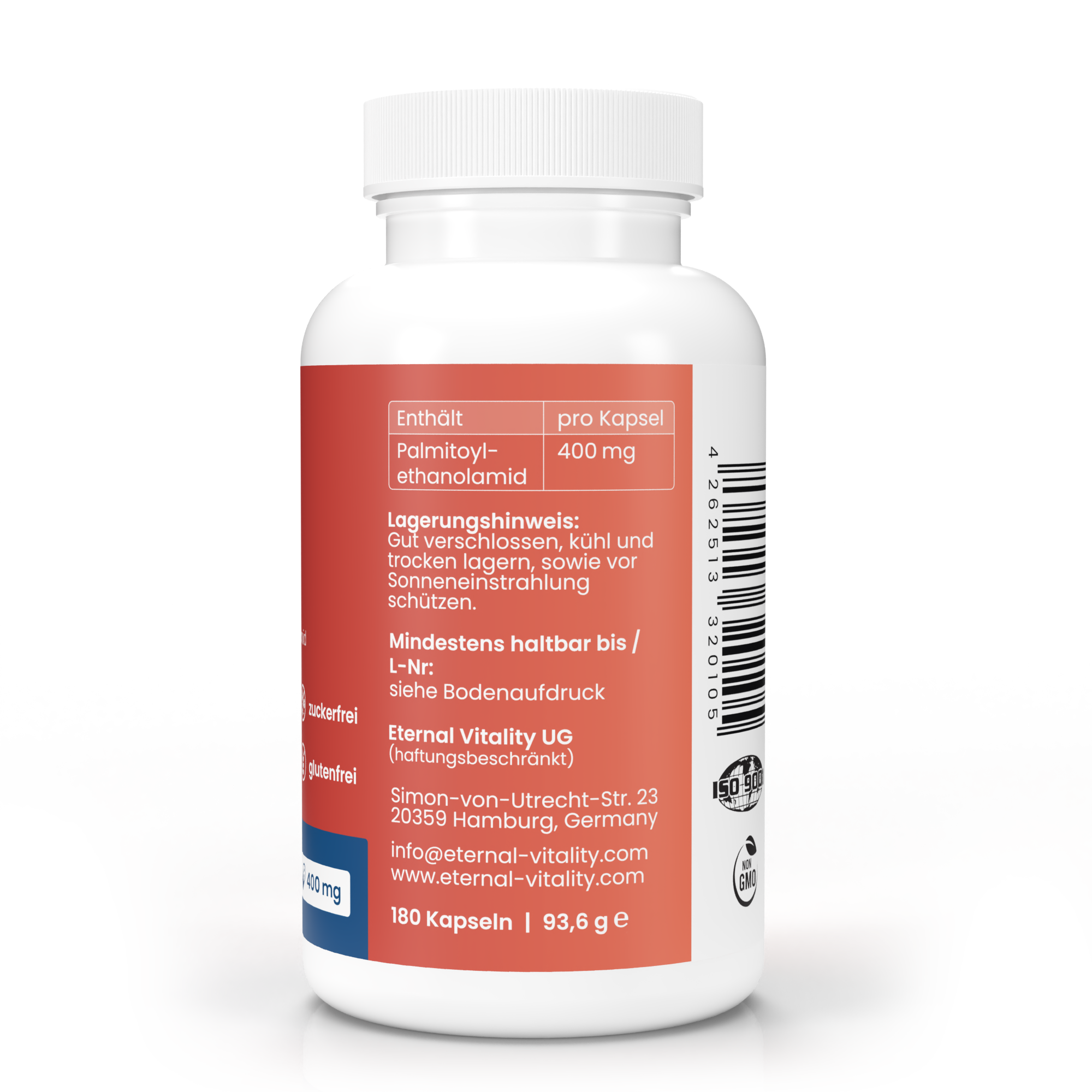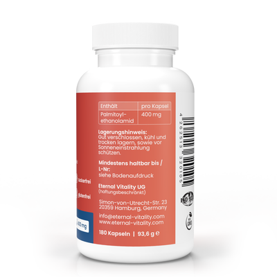Eternal Vitality® PEA liefert 400 mg reines Palmitoylethanolamid pro Kapsel – ultra-mikronisiert, vegan und frei von Zusatzstoffen. Wenn dein Körper gefordert ist, unterstützt dich Eternal Vitality® PEA mit Palmitoylethanolamid (PEA) – einer körpereigenen Substanz, die der Organismus in Phasen erhöhter Belastung wie Stress oder Anspannung bildet. Unser hochwertiges PEA hilft deinem Körper, sein natürliches Gleichgewicht zu bewahren und sorgt für eine kontinuierliche Versorgung mit diesem wertvollen Molekül.